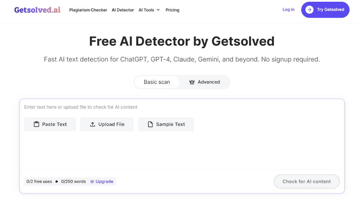 If you’re looking for a fast and reliable option, the AI detector by GetSolved is worth checking out. This online service gives clear results without burying you in complicated reports. It comes with a built-in smart assistant that highlights suspicious text and offers useful context instead of random numbers. Since it also doubles as a plagiarism checker, it works well for students, editors, and teachers who need something quick and accurate.
