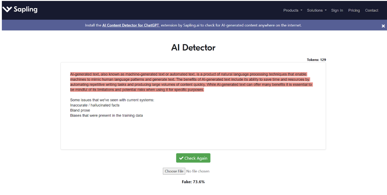 Sapling is a handy option for people who want quick checks without complicated steps. It runs straight in the browser and works well for shorter texts like emails, reports, or class submissions. It’s light, fast, and gives a clear confidence score that’s easy to read.