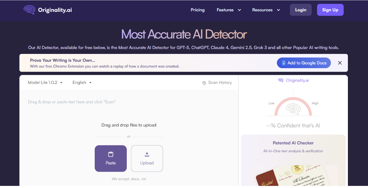 Originality.ai is built mostly for publishers and content creators. It scans text for multiple AI models and gives a clear breakdown that’s easy to share with a team. It’s not free, but it’s popular with agencies and platforms that need strong results.
